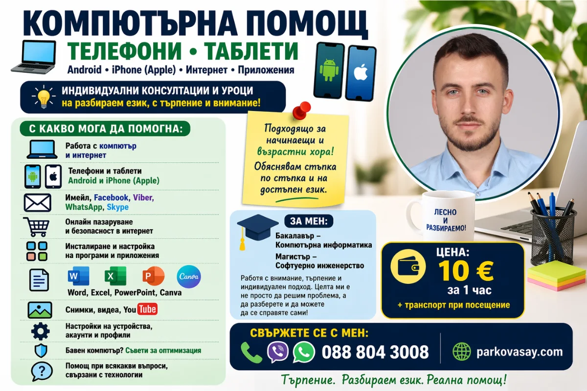 Търсите компютърна помощ в Шумен или съдействие с телефон, таблет, Android, iPhone, интернет, Word, Excel, приложения или настройки? Предлагам индивидуални консултации и обучение по компютърна грамотност, подходящи за начинаещи, възрастни хора и всички, които искат да подобрят уменията си.