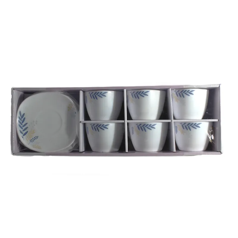 Елегантен комплект от 6 чаши за кафе с подложки, подходящ за ежедневна употреба и за сервиране на кафе при гости. Изработени от качествен порцелан, чашите се отличават с изчистен дизайн и деликатен флорален мотив в синьо и бежово, който добавя стил и уют към вашата кафе пауза.