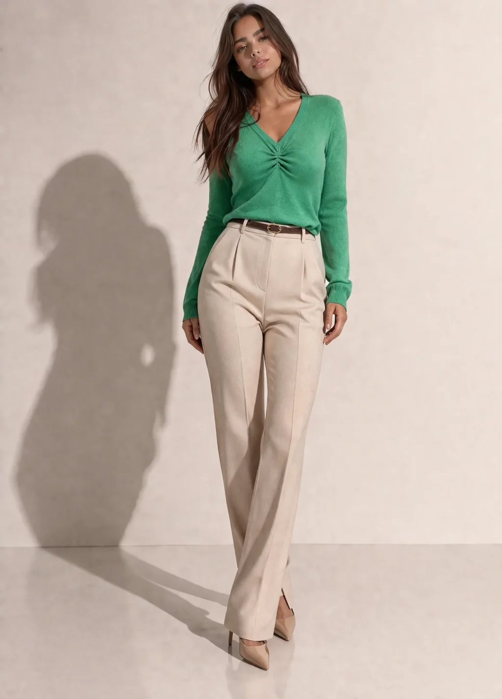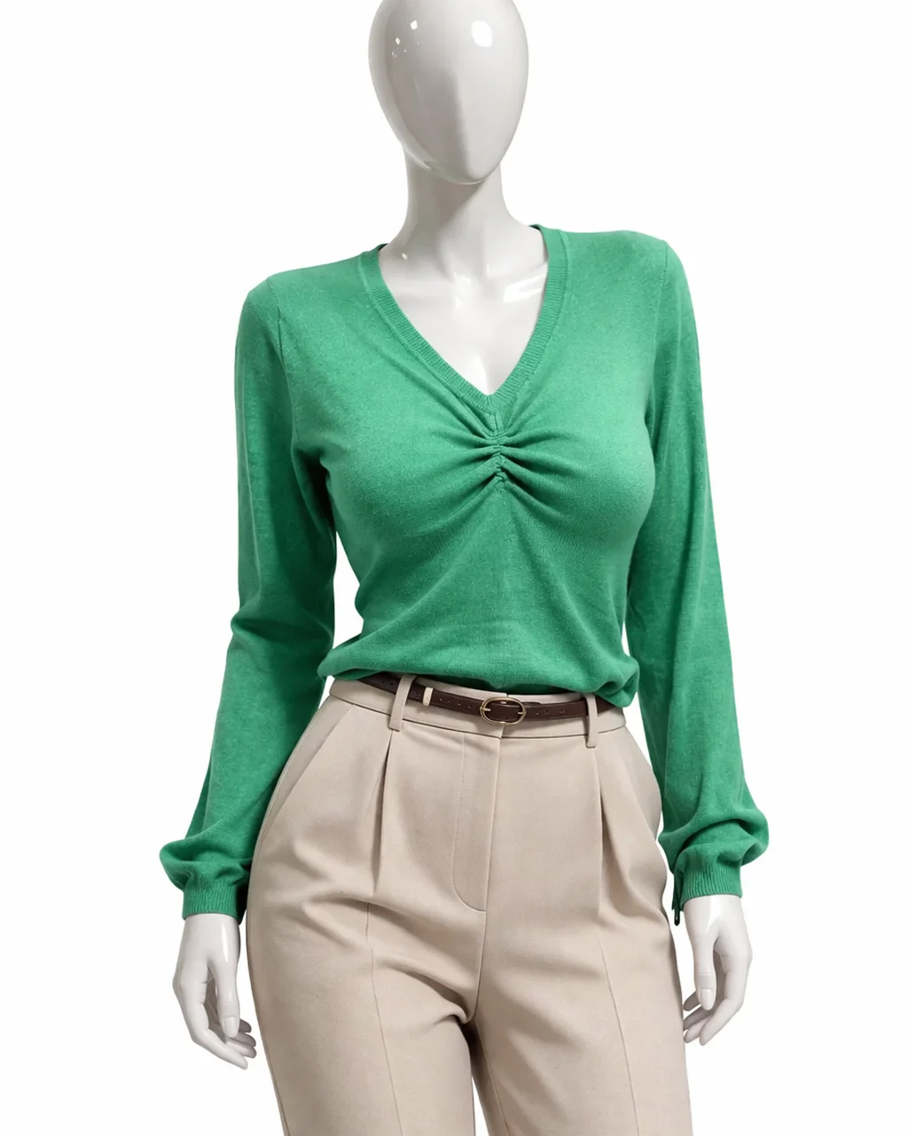 Елегантна дамска блуза в свеж зелен цвят, съчетаваща комфорт и стил. Моделът е с дълъг ръкав и V-образно деколте, което подчертава женствената линия. Нежното наборче в предната част придава ефектен акцент и оформя силуета по изискан начин.