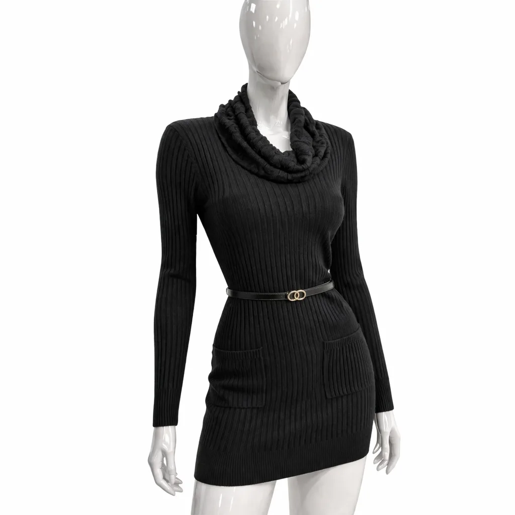 Елегантна дамска рокля в класически черен цвят, изработена от мека и еластична плетена материя с вертикална релефна структура. Моделът е с ефектна шал яка, която придава стил и уют, и с дълъг ръкав – подходящ за по-хладните дни. Кройката подчертава фигурата и позволява удобно носене както в ежедневието, така и при по-елегантни поводи.