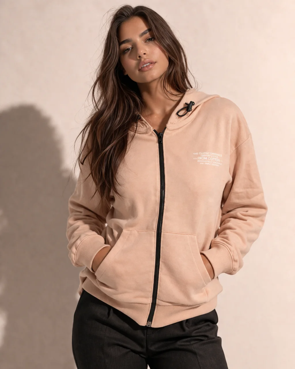 Стилен и удобен дамски суичър, подходящ за ежедневието, разходки и спортно-елегантна визия. Моделът е с практичен цип по цялата дължина, качулка с връзки и предни джобове за допълнителен комфорт. Материята е мека и приятна на допир, осигурява свобода на движение и удобство през целия ден. Нежният розов цвят придава свеж и женствен акцент към визията.
