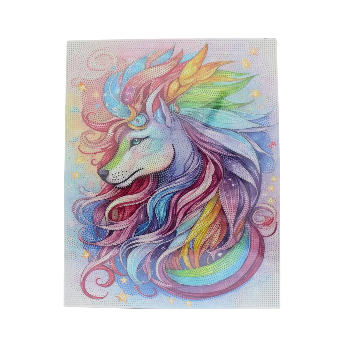 Диамантеният гоблен „Мистичен вълк“ съчетава силата на дивата природа с модерно художествено излъчване. Вълкът е изобразен в богата цветова палитра с дъгови преливания, които създават усещане за енергия, движение и свобода.