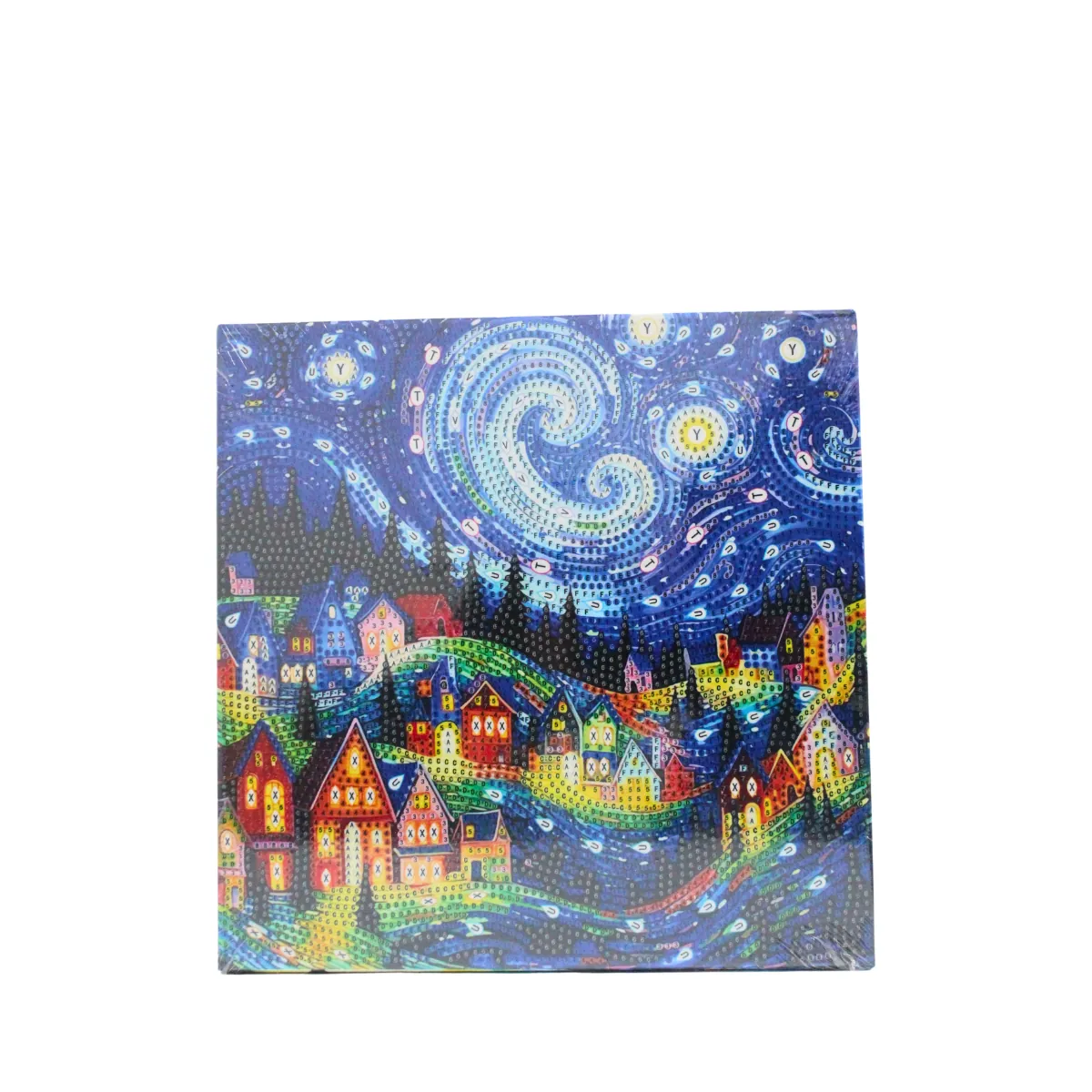 Диамантеният гоблен „Звездна нощ над селото“ представя живописен нощен пейзаж с цветни къщи, заобиколени от вихрено звездно небе. Динамичните линии и наситените сини и жълти тонове създават усещане за движение, дълбочина и артистична емоция.