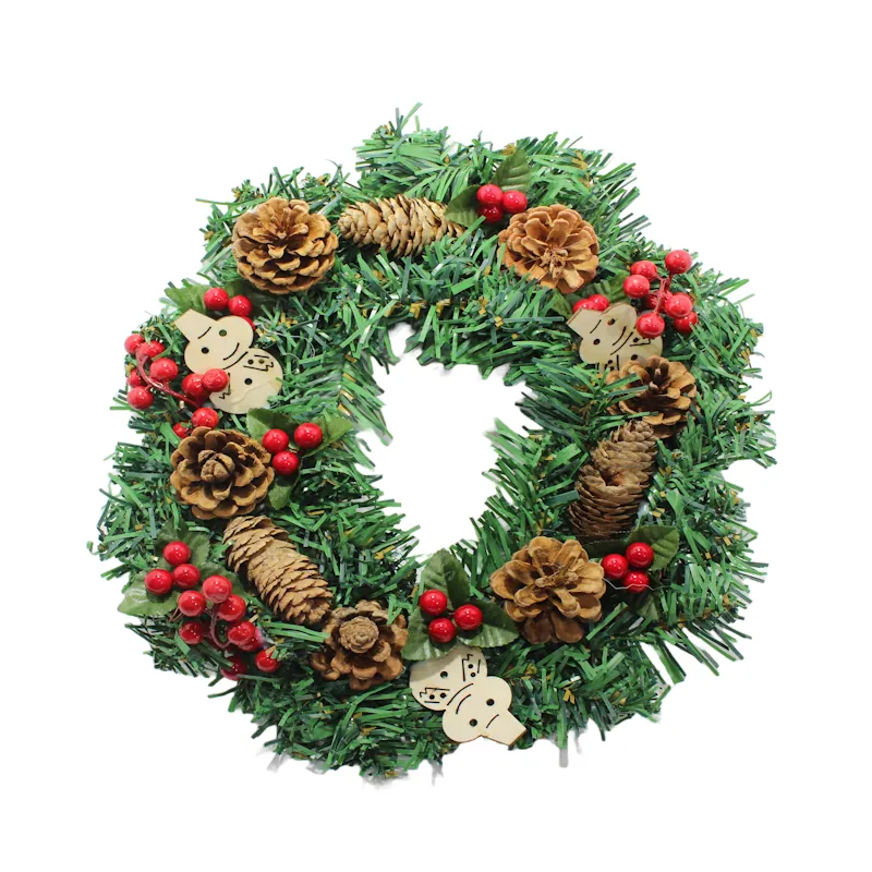 Коледен декоративен венец за врата с диаметър 30 см, изработен от изкуствена зеленина и украсен с шишарки, червени плодчета и дървени коледни фигурки. Подходящ за външна и вътрешна декорация – за входна врата, стена или празничен кът. Създава уютна и празнична атмосфера у дома.