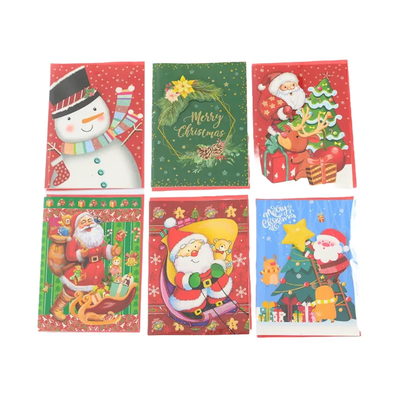 Картички с различен дизайн  — снежен човек, Дядо Коледа, елха, подаръци и коледни украси.