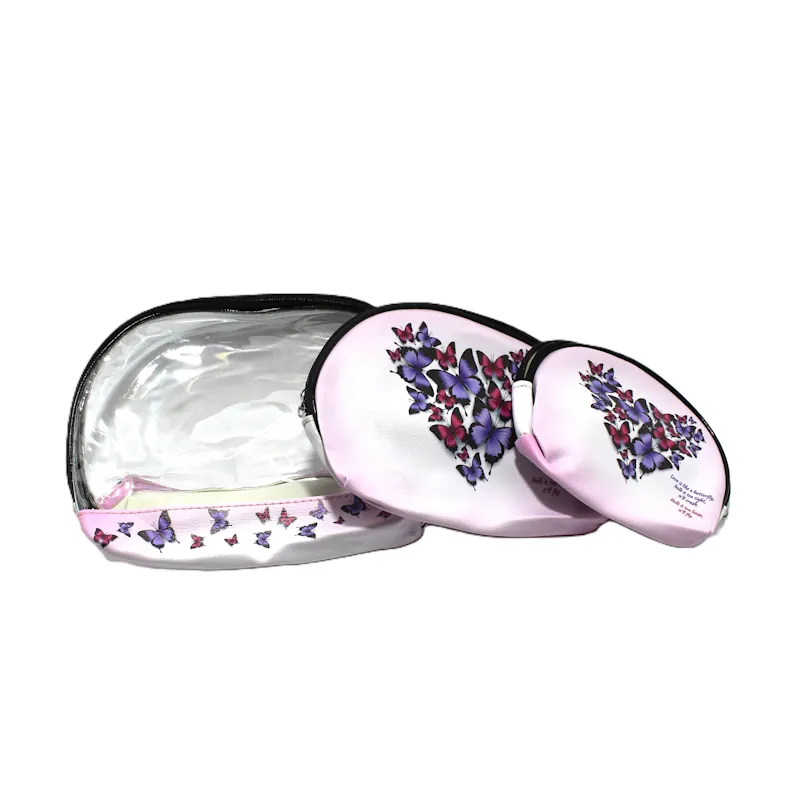 Практичен и стилен комплект от три несесера за гримове и козметика. Всеки несесер е с красив дизайн с цветя и пеперуди, подходящ за пътуване или ежедневна употреба. Най-големият е с прозрачен капак за лесна видимост на съдържанието, а останалите два са с удобен цип и мека вътрешна подплата.
