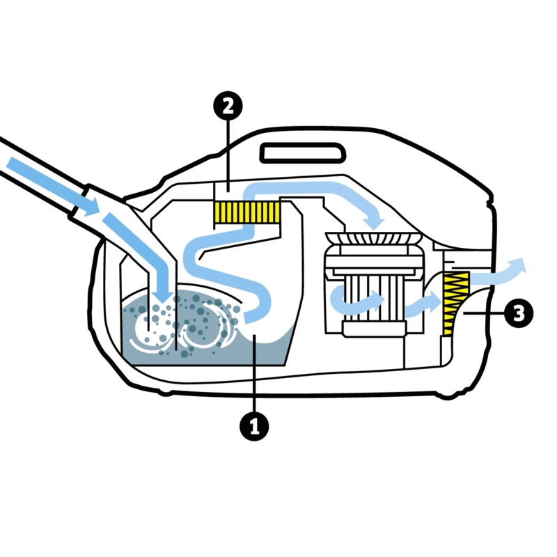 DS 6 е прахосмукачка с воден филтър, която не само старателно почиства подовете, но също така осигурява по-свеж въздух, както и изходящ въздух, от който до 99,95% от праха е отстранен. Това значително подобрява въздуха, а с това и усещането в помещението. За разлика от конвенционалните прахосмукачки с филтърни торбички, прахосмукачката DS 6 с воден филтър разчита на естествената сила на водата, която се върти около филтъра с висока скорост. Погълнатата мръсотия преминава през тази въртяща се вода, която я филтрира от въздуха много ефективно и я улавя. Резултатът е свеж, изключително чист отработен въздух.