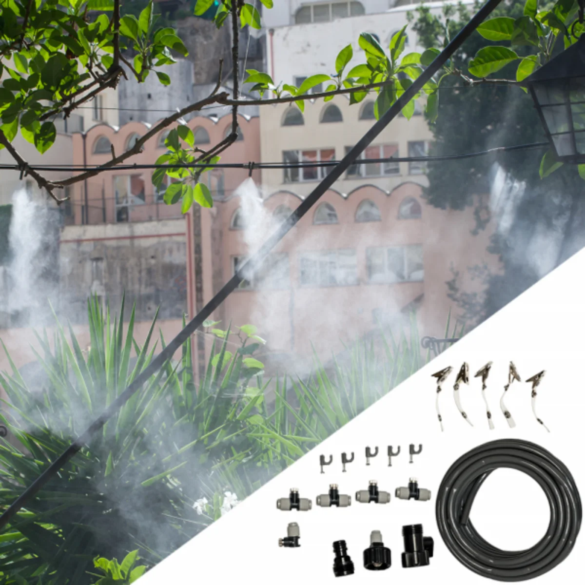 Системата работи чрез разпръскване на микроскопични водни капчици, които бързо се изпаряват и охлаждат въздуха, без да намокрят околните повърхности. Освен освежаващ ефект, мъглуването има и допълнителни ползи – намалява праховите частици във въздуха, създава защитна водна пелерина срещу насекоми и придава красив визуален ефект на градинската среда.