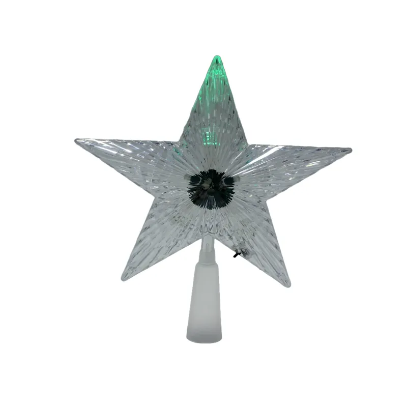 Коледна звезда за връх на елха, изработена от прозрачна пластмаса със сияещ ефект. Добавя елегантен и празничен завършек на коледното дърво и създава магическа атмосфера у дома.