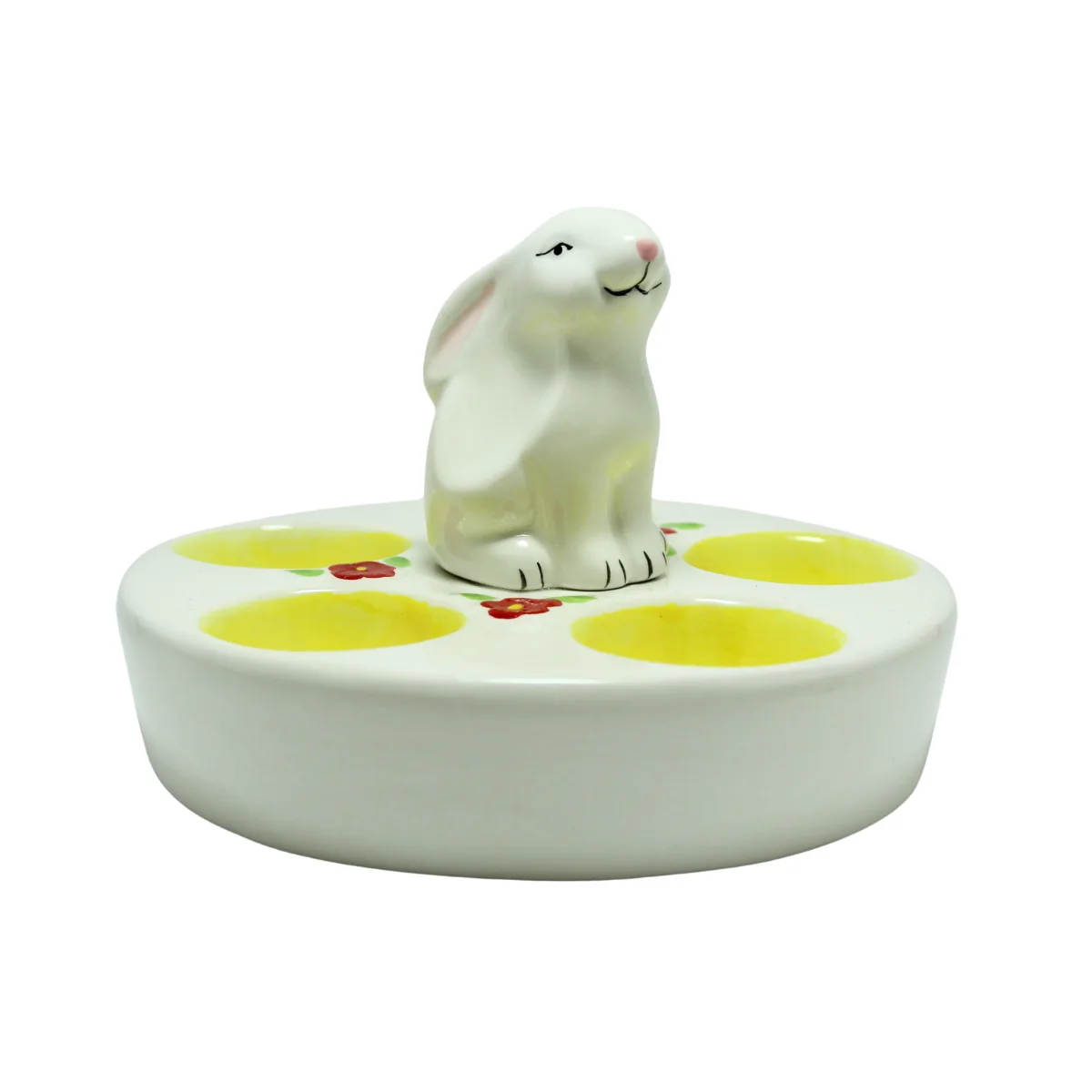 Поставката е изработена от качествен порцелан и разполага с 5 отделения за яйца, което я прави практична както за сервиране, така и за украса. Централната декоративна фигурка на заек придава очарователен вид и превръща продукта в красива част от великденската декорация. Подходяща е както за семейни празнични обеди, така и за декорация на кухнята или трапезарията.