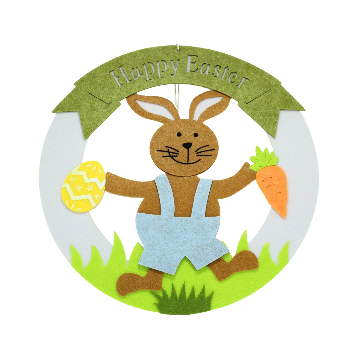 Декорацията е изработена от мек филц и е оформена като венец, който може лесно да се окачи на врата, стена или прозорец. Дизайнът включва пролетни елементи като великденско яйце, морков, цветя и надпис „Happy Easter“, които придават свеж и празничен вид. Подходяща е както за декорация на дома, така и за украса на детска стая, витрина или офис пространство.