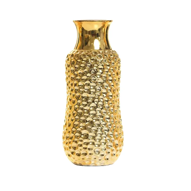 Тази елегантна декоративна ваза в златен цвят е създадена, за да привлича погледи и да носи усещане за изтънченост и блясък във всяко пространство. С изваяна текстура от релефни елементи, тя отразява светлината по красив и изразителен начин, превръщайки я в истински декоративен шедьовър.